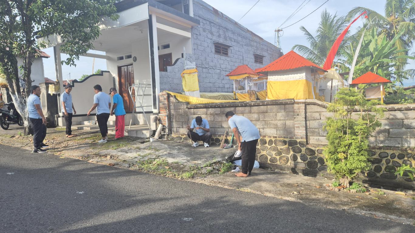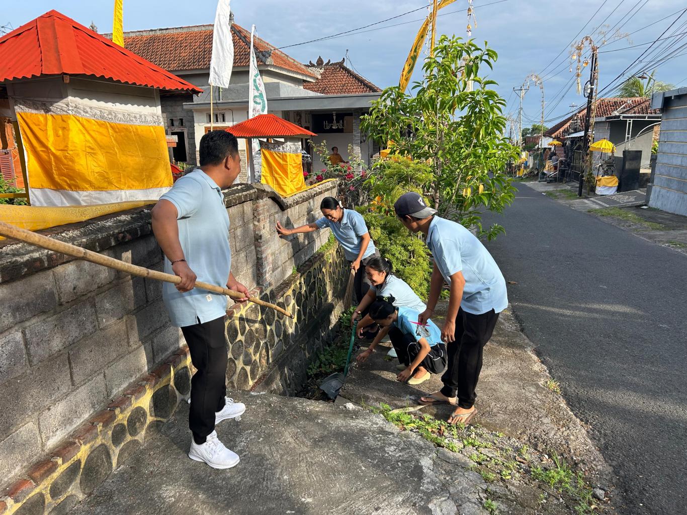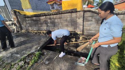 Kegiatan kerja bakti membersihkan selokan di area desa untuk menjaga kebersihan lingkungan dan mencegah risiko banjir serta penyakit.
